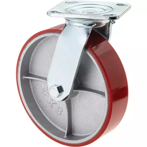 This heavy-duty 360 degree swivel caster has an injection molded polyurethane elastomer tire surface.