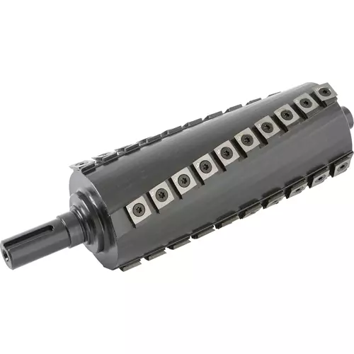 The indexable carbide inserts are positioned along a helical pattern with the cutting edges at a slight angle to the workpiece for a shearing action that leaves a glassy smooth cut even on the toughest of woods.