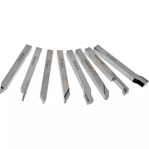 This set comes with these sharpened profiles: offset right and left-hand tools with chip breaker, straight and ship breaker style treading tools, internal threading tool, parting tool, boring tool and turning tool.