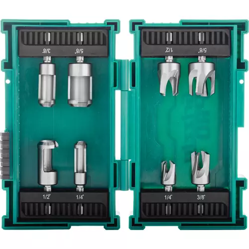 This HSS tenon and plug cutter hex shank set comes in a hard plastic case for convenient storage and protection.