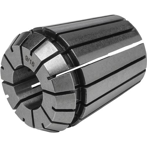 The 9/16" ER32 Spring Collet squeezes against the tool or workpiece to be held, forming a collar that locks it in place.