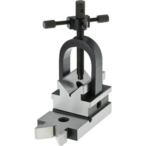 Crafted to maximize the accuracy of just about any setup for grinding and milling. This All Angle V-Block is supplied with 3- 3/8"-16 threaded holes so you can easily mount it to fixtures, jig plates or angle plates and hold round stock up to 1-1/4" in the horizontal or vertical positions. Hardened better than 45 on the Rockwell hardness scale for durability. Stirrup is supplied with adjustable clamp stop. Measures 3 5/8" X 1 7/8" X 1 7/8".