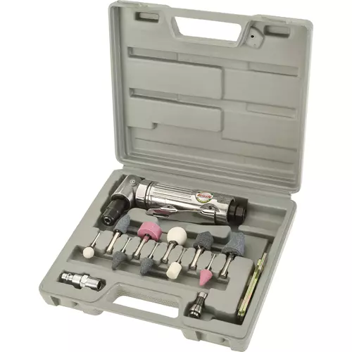 This Angle Die Grinder Kit features a compact design, safety paddle switch, 1/4" NPT inlet and accepts 1/8" and 1/4" shanks. Includes male quick connect coupling, 10 grinding stones, 1/8" and 1/4" collets, and collet wrenches.