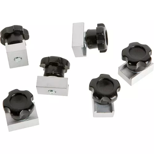 Stack 2 edge guides back-to-back and fasten them together with these adaptors for double-duty material holding and extra clearance between the workpiece and workbench. Just slide the adaptor between two Edge Guide Clamps (T28935, T28942 and T28943), tighten the knob, and you're ready go by securing one edge guide to your work surface and the other to your work material.6 piece set Material: aluminum Size:3/4" x 1/2" x 3/4"