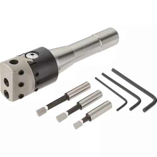 Anyone creating models or any fine precision work in smaller scales will be glad to see this new Boring Head Set.  These smaller, yet sophisticated sets sport a dial with calibrations of .001" and .050" per revolution, sockets for 3/8" boring bars, 9/16" hole offset and dovetail slide with locking clamp.  Come with 3 boring bars and wrenches.