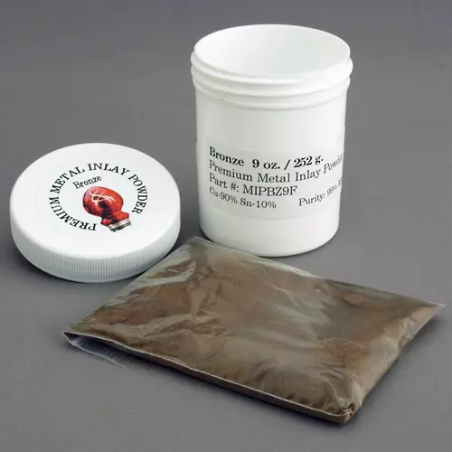 Premium Metal Inlay Powders are available in copper, brass, aluminum, and bronze. These powders will give you a shiny metal inlay in your turned or flat wood projects. Perfect for use in carved or laser engraved motifs, great for disguising cracks and blemished wood. See the T25309 Metal Inlay Techniques DVD to learn how best to use these powders and give shine to your projects! Nine ounce size of the bronze powder.
