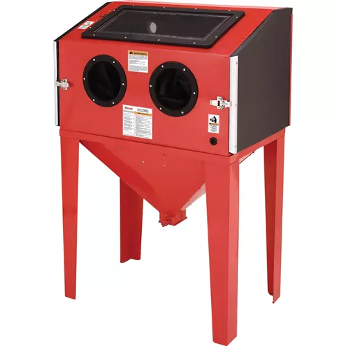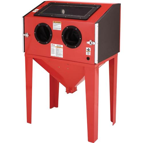 Blast away paint and rust without making a mess around your shop. Two large doors make loading and unloading a snap and the lower hopper stores the sandblasting media for reuse or easy removal. Includes an industrial-duty blast gun with ceramic tip and siphon hose, sealed rubber gloves, built-in light and large viewing window. Requires a 5 HP air compressor or larger. Overall size 36" W x 22-1/4" D x 55" H. Approximate shipping weight: 120 lbs.