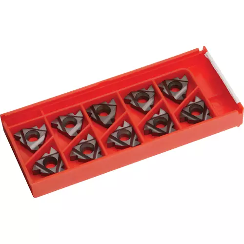 These coated inserts are ground to 60° points, 0.008" end radius, lots of back rake and 1.5° side rake. Fits our H8305, H8306 and H8307 right hand internal threading boring bars.