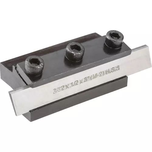 These Clamp Type Cut-off Tool holds 1/2" wide cut off blades and 3/8" x 3/8" tool holder and are finished in black oxide coatings. Includes 3/32" x 1/2" x 3" M-2 cut off blade and hex wrench.