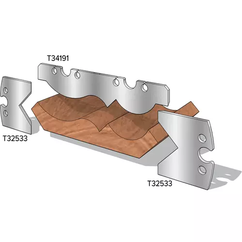 Note: Two sets of these knives are required to create the profile as illustrated. Use with T34191 4-¾" Crown Moulding Top Knives when creating full crown mouldings.