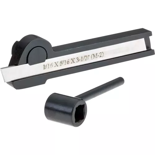 Small enough to fit most 4-way turret tool posts, but rugged enough to handle the job, this cut-off tool holder is a must. Comes with a wrench and cut-off tool bit. Uses 1/16" x 5/16" x 3-1/2" tool bits. Shank measures 5/16" x 9/16" x 2-1/4".