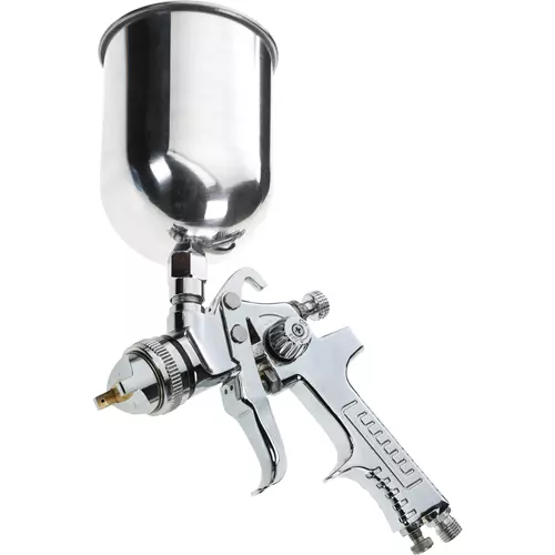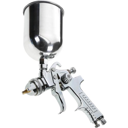 When durability is essential, this Spray Gun is your best bet. Features die cast aluminum alloy gun body with two step trigger control, air adjustment valve, and a corrosive resistant metal 600cc paint cup.