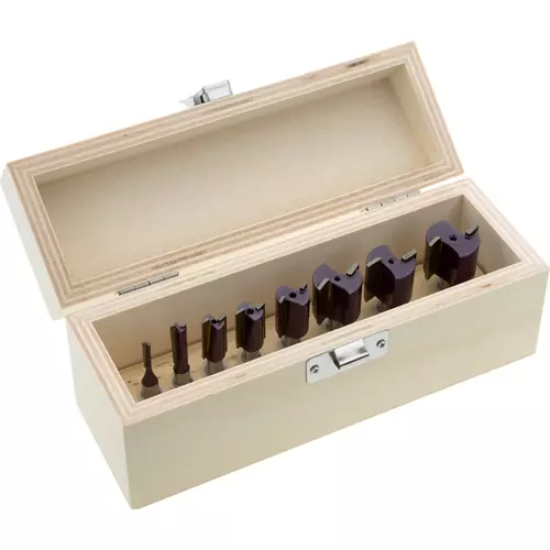 Never be at a loss for the right size of carbide straight bit when you need it most. This complete set contains 1/8", 1/4", 13/32", 1/2", 19/32", (2) 27/32" and 15/16" bits. 1/4" shank. Includes wooden box.