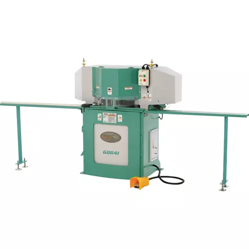 Designed for production, this Double Miter Saw simultaneously cuts two 45 degree angles for perfect 90 degree joints. The blade swing arms are micro adjustable for perfect angles and the foot pedal control activates the pneumatic hold downs and swing arms. The two side wings support long stock and the stop block can be set for cutting multiple pieces of uniform length. Two 12" blades provide plenty of cutting capacity and an adjustable stroke speed gives you plenty of cutting control.