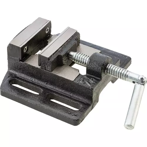 With a twist of the Acme screw threads, the cast-iron 2-1/2" vise firmly will hold metal, wood, plastic, or whatever else you need secured for drilling.