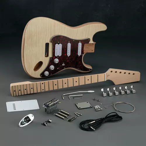 Exceptional Character What sets this guitar kit apart is the quality and type of wood in its construction. The solid mahogany body is wrapped by fiddleback maple veneer on the front and back, and offers an unrivaled aesthetic appeal.