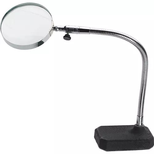 For close-up, hands-free viewing, this Flexible Neck Magnifier offers 2-power magnification, a 12" flexible arm and a felt protected cast iron base. The 4" lens is completely adjustable for any application. Great for precision assembly work.