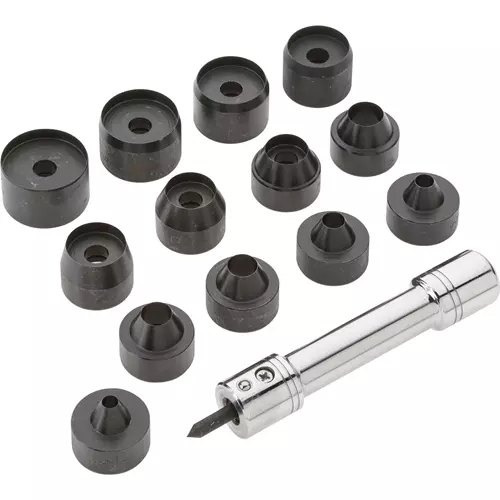 Set includes the following diameters: 1/4", 5/16", 3/8", 7/16", 1/2", 5/8", 3/4", 7/8", 1", 1-1/8", 1-1/4", 1-3/8" and 1-1/2" and striker with spring-loaded center punch.