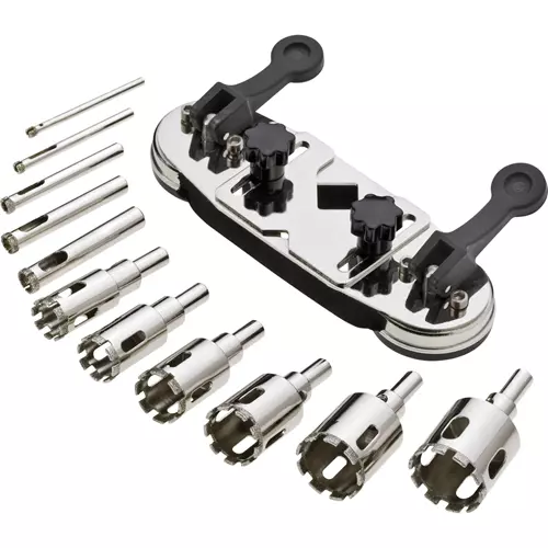 The T10538 Glass/Granite Drilling Set features 11 diamond bits that cut through mirrors, non-tempered glass, ceramics, porcelain, limestone, marble and granite.These bits can be used with a handheld drill or drill press. Use a drill press whenever possible for greater control and precision.