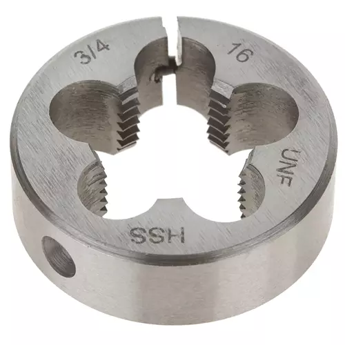 The G6957 3/4"-16 x 1-1/2" HSS Round Adjustable Split Die provides straight, clean, and easy threading.