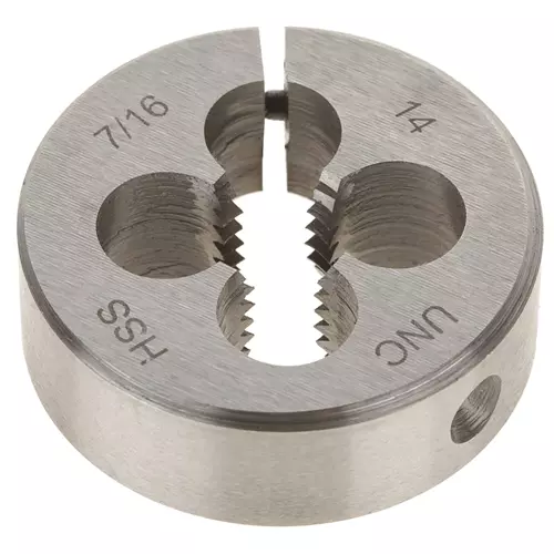 The G6948 7/16"-14 x 1-1/2" HSS Round Adjustable Split Die provides straight, clean, and easy threading.