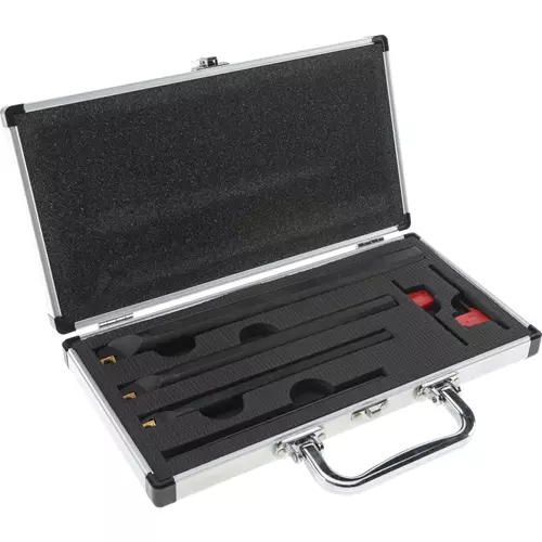 The precision made four-piece H8185 Indexable Boring Bar Set features 80° diamond CCMT inserts with negative 5° end and side cutting angles.