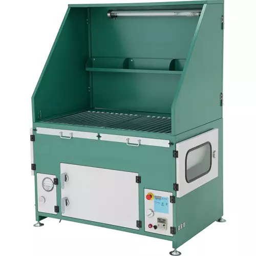 This Downdraft Table uses a unique paper filter on a roll to trap oil contamination, which would otherwise clog the pleated filters. Maximum CFM is maintained by an electronic paper filter advance mechanism.