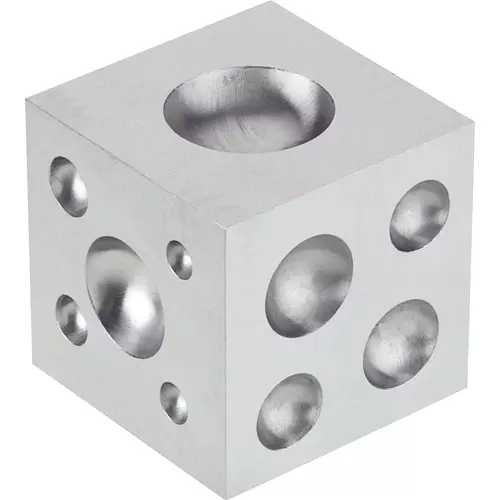 This Jeweler's Dapping Die Block measures 2-1/2" x 2-1/2" x 2-1/2" and made of solid steel. Features 6 faces with various sized dies. Use to shape softer metals.