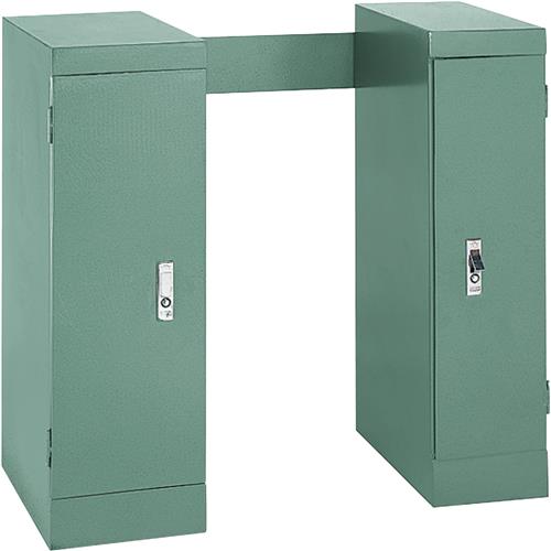 Each of the cabinets has a hinged door, push-button latch, and a welded steel shelf.