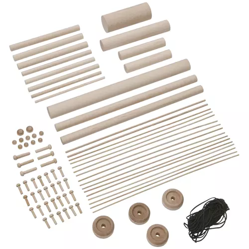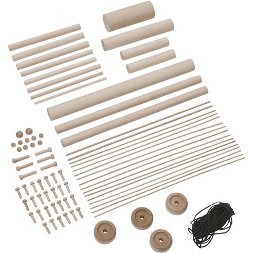 Lattice boom crane detail kit includes: axle pegs 13/16" x 5/32" (20); axle pegs 1-1/4" x 7/32" (5); axle caps for 3/16" dowel (10); axle caps for 1/4" dowel (2); wheels (4); dowel 1-1/2" x 4" (1); dowels 1" x 6" (3); dowels 3/4" x 4" (2); dowel 5/8" x 6" (4); dowels 1/2" x 4" (3); dowels 3/8" x 6" (3); dowel 1/4" x 4" (1); dowel 3/16" x 6" (1); dowel 1/8" x 12" (2); dowels 3/32" x 12" (14); and 20" cable (1).