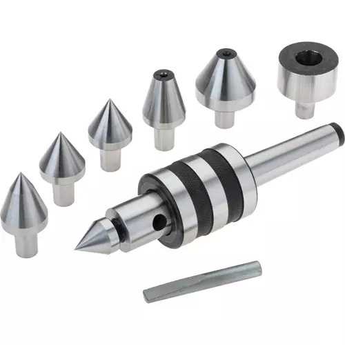 A blend of quality and convenience, this Live Center Set offers seven interchangeable tips. High quality needle bearings prolong tool life and special tool steel body and tips are precision-ground. Supplied in box. Morse Taper: #2.