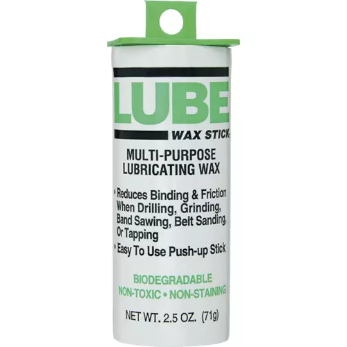 Biodegradable, non-staining wax reduces binding and lubricates when drilling, grinding, bandsawing, or belt sanding. This 2-1/2-ounce push-up stick is also great for wood screws and silencing squeaky doors, windows and table saw fence rails. Made in the U.S.A.