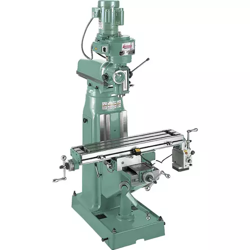 Specifications: Spindle taper: R-8 Spindle travel: 5-1/4" Table size: 7-7/8" x 35-3/4" Table travel (longitudinal): 20-1/2" Table travel (cross): 9-1/2" Table travel (vertical): 13-3/4" Max. dist. spindle to column: 15-1/2" Max. dist. spindle to table: 13-3/4" Knee travel: 13-3/4" Head travel: 10-1/4" Head tilt: 90° left and right Turret or column swivel: 360° T-slots: 3 on 2-1/2" centers, 1/2" stud Number of speeds: 5 Range of speeds: 255, 425, 685, 1115 and 1800 RPM Motor: TEFC capacitor start induction Horsepower: 2 Phase: single-phase RPM: 1725 Power Transfer: V-belts Bearings: shielded and lubricated for life Overall Height: 75" Shipping weight approx.: 1701 lbs.