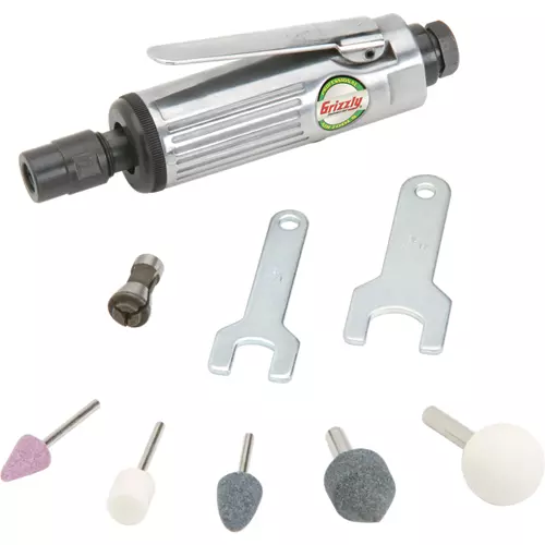 This Mini Air Die Grinder Kit with 1/4" NPT inlet includes 1/8" and 1/4" collets, collet wrenches and five grinding stones. Grinding stones include ball, cylindrical and taper. 25,000 RPM.