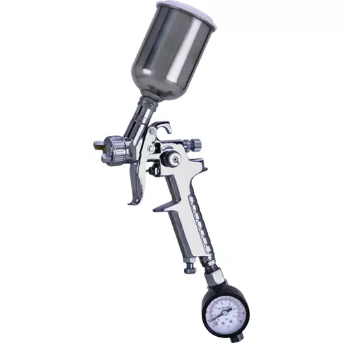 HVLP technology delivers high transfer efficiency while lowering material costs and reducing airborne pollutants. Easy-to-clean stainless steel cup is great for small jobs. Sprays a wide variety of finishing materials. Features an in line regulator and pressure gauge.