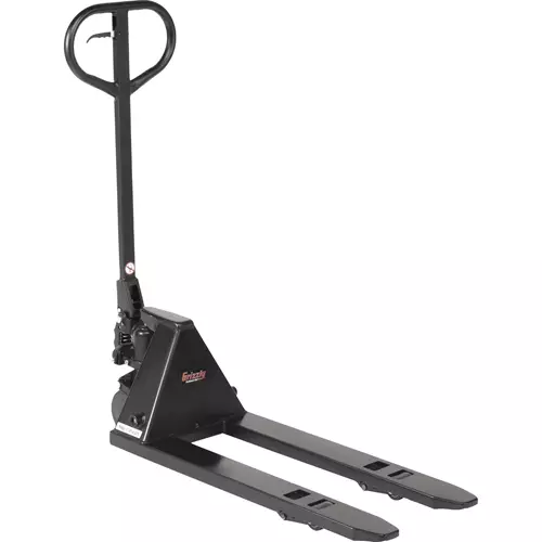 This small-space pallet jack is a great choice for moving pallets, machines, packaged products, and more in areas with little clearance. With narrow forks it fits into spots that a normal pallet jack can't, so you can relocate items with minimal effort.