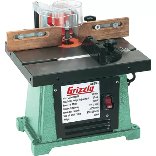 Motor: 3/4 HP, 110V, 60 Hz Spindle size: 1/2" Collet size: 1/4" Maximum cutter height: 1-9/16" Maximum cutter height adjustment: 19/32" Spindle speed: 9,500 RPM Table size: 11-13/16" x 9-13/16" Fence: Independently adjustable Dust port: 2-1/2" Accepts 1/4" router bits Weight: 45 lbs.