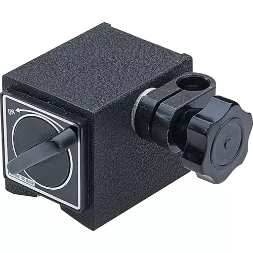 This Multi-Purpose Magnetic Base fixes indicators and test equipment to all ferrous metal with just the turn of a dial. Locking arm attachment point measures 10mm diameter. V base attaches to round pipe as well as flat surfaces. The side opposite the dial is also activated by the dial. Base measures 60mm long by 50mm wide. You can make a variety of jigs with this base.
