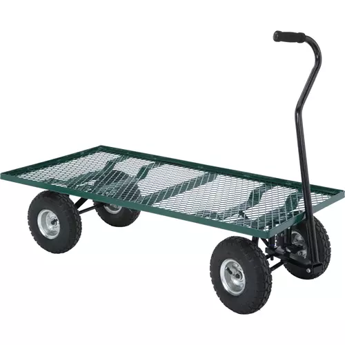 Designed primarily for the nursery industry, this platform truck with extra-large 10" x 3-1/2" pneumatic lug wheels is perfect for just about anything weighing up to 350 lbs. Heavy-gauge grating provides superior strength and support. Tubular steel steering handle delivers plenty of leverage for confident control over a variety of surfaces. 48"L x 24"W x 13"H. Shipping weight approximately 64 lbs.