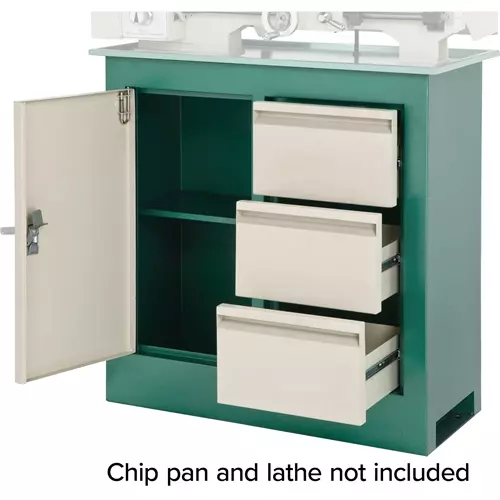 Combined with the cabinet, three 9" drawers easily store your manual, chucks, faceplates, tailstock tooling, lathe dogs, steady rests, and dedicated toolbox with ease.
