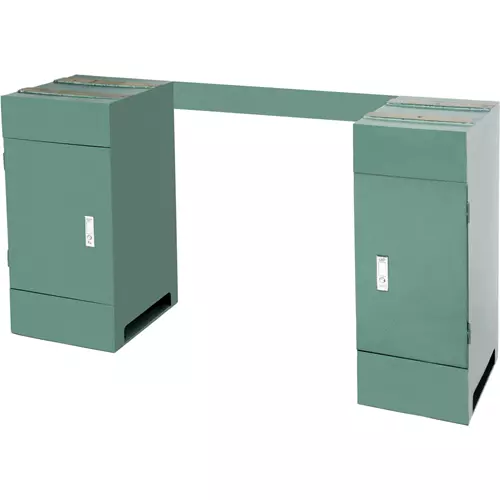 Each of the cabinets has a hinged steel door, push-button latch, and a welded steel shelf.