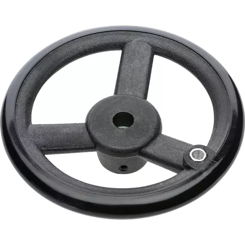 A durable, yet inexpensive alternative to cast metal handwheels.The handwheel includes a locking setscrew.