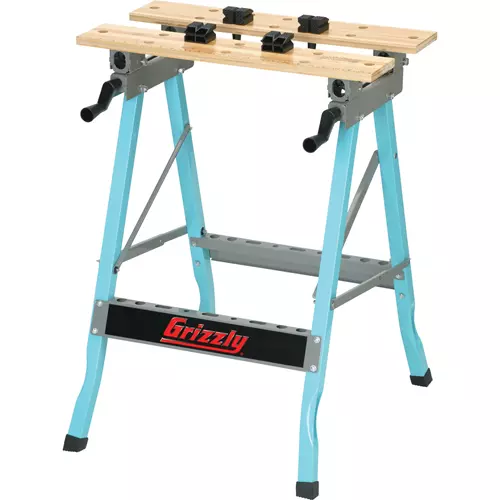 24" x 9-1/2" work surface features 4-1/4" clamping capacity and weight capacity of 220 lbs. (100kg). Independently adjustable hand screws for irregular clamping. Includes four adjustable clamping dogs for securing flat work. Folds down for convenient storage. Includes wrench and instructions for easy assembly. Overall size: 31-1/4" tall x 24" wide x 25" deep. Weighs 18 lbs. Color may be green or blue.