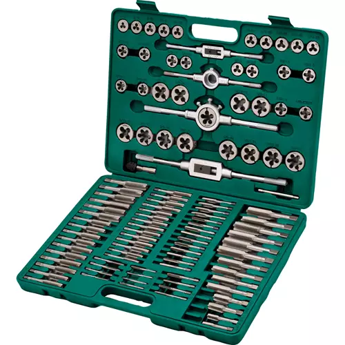 This 110-piece tap and die set includes popular SAE, metric, machine, and NPT sizes to achieve precision threading requirements for both internal and external threads. It includes both bottoming and plug taps, as well as the corresponding dies of the same size.