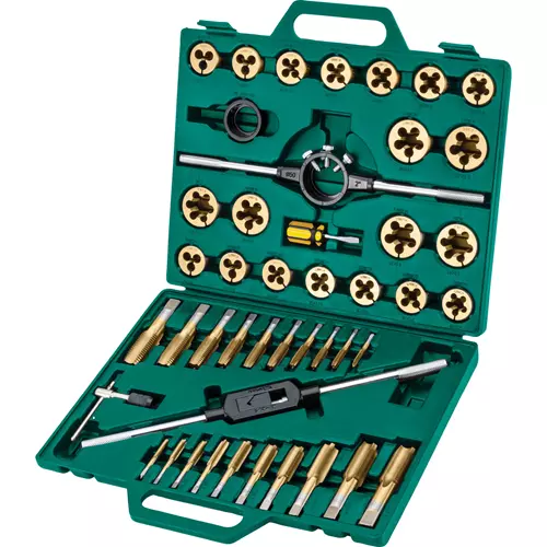 This 45-piece tap and die set includes popular metric sizes to achieve precision threading requirements for both internal and external threads. It includes both plug taps, as well as the corresponding dies of the same size.