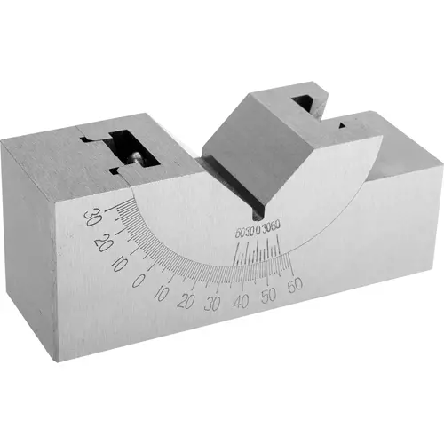 Lock in any angle from 0 - 60 degrees for precision milling, drilling and set up work. This hardened and precision ground angle block features a 90 degree "V" and 1/10 degree vernier scale. 0.0003" accuracy.