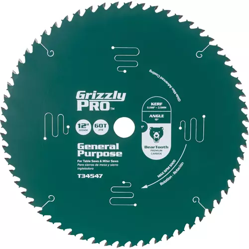 T34547 Grizzly PRO™ 12" x 1" 60T ATB Combination Saw Blade