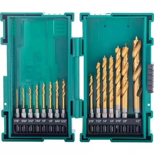 T34201 15-Pc. M2 HSS TiN-Coated Quick-Release Hex Shank Brad Point Bit Set