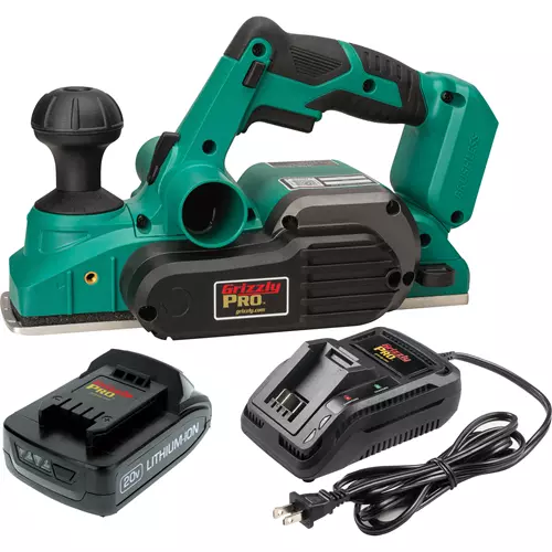 Like all Grizzly PRO tools, the Grizzly PRO Handheld Planer is powered by a low profile and incredibly lightweight 2.0Ah Lithium-Ion battery for all-day performance. One T30304 2.0Ah Lithium-Ion Battery is included in this kit. These batteries can be used on all the Grizzly PRO hand power tools and are easily charged with the included 2.4A Fast Charger.