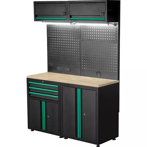 Imagine a streamlined workspace where your essential tools are perfectly organized and easily accessible beneath focused LED lighting. The Grizzly PRO™ T34534 4-Piece Modular Cabinet Set makes a truly efficient workspace a reality, integrating ample and sturdy workbench space with a solid butcher block top with organized storage solutions, all without compromising valuable floor space. Designed to transform your garage or workshop into an efficient and a well-lit work area.